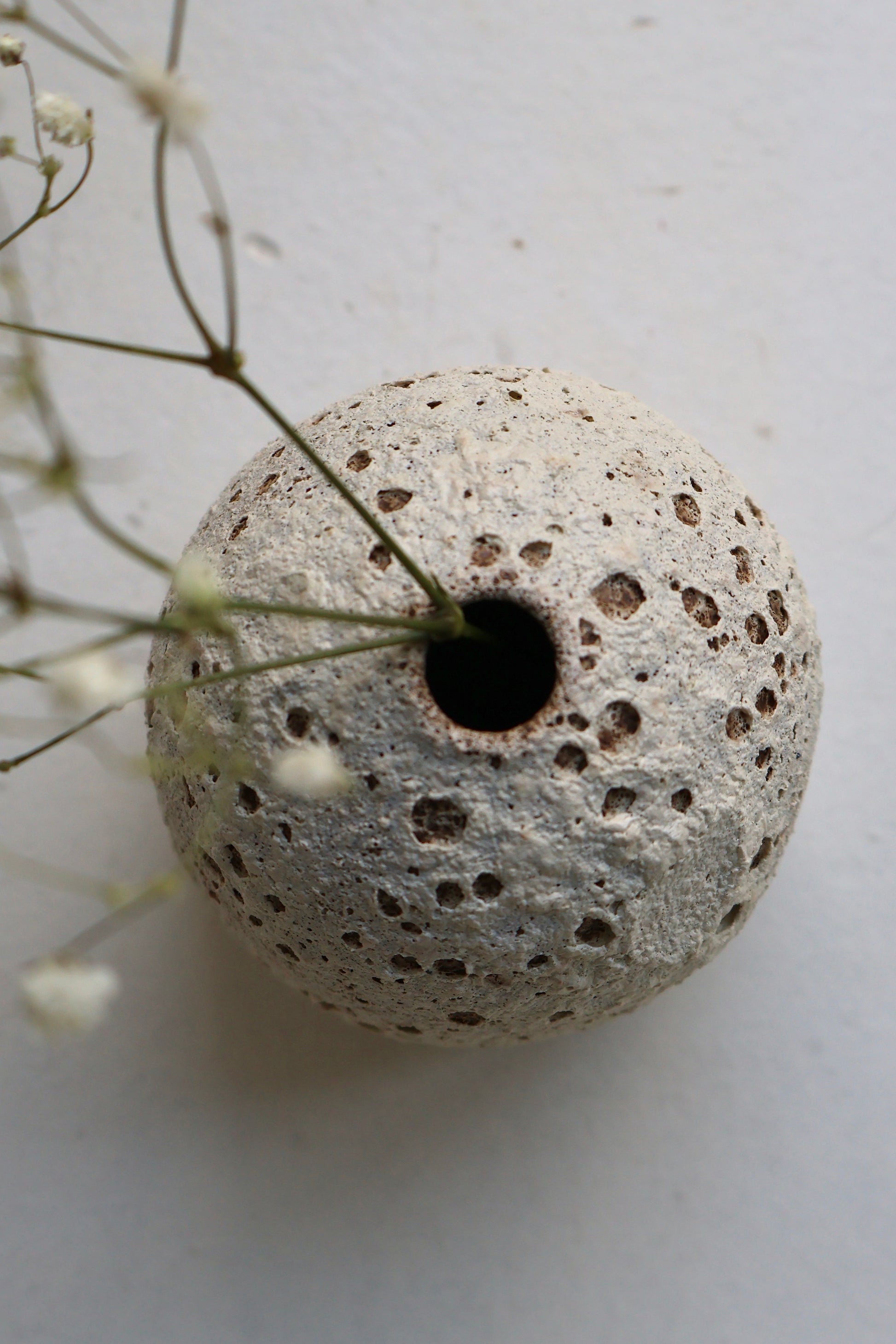 Bud vase glazed in matte white lava glaze and a white glaze on the inside.