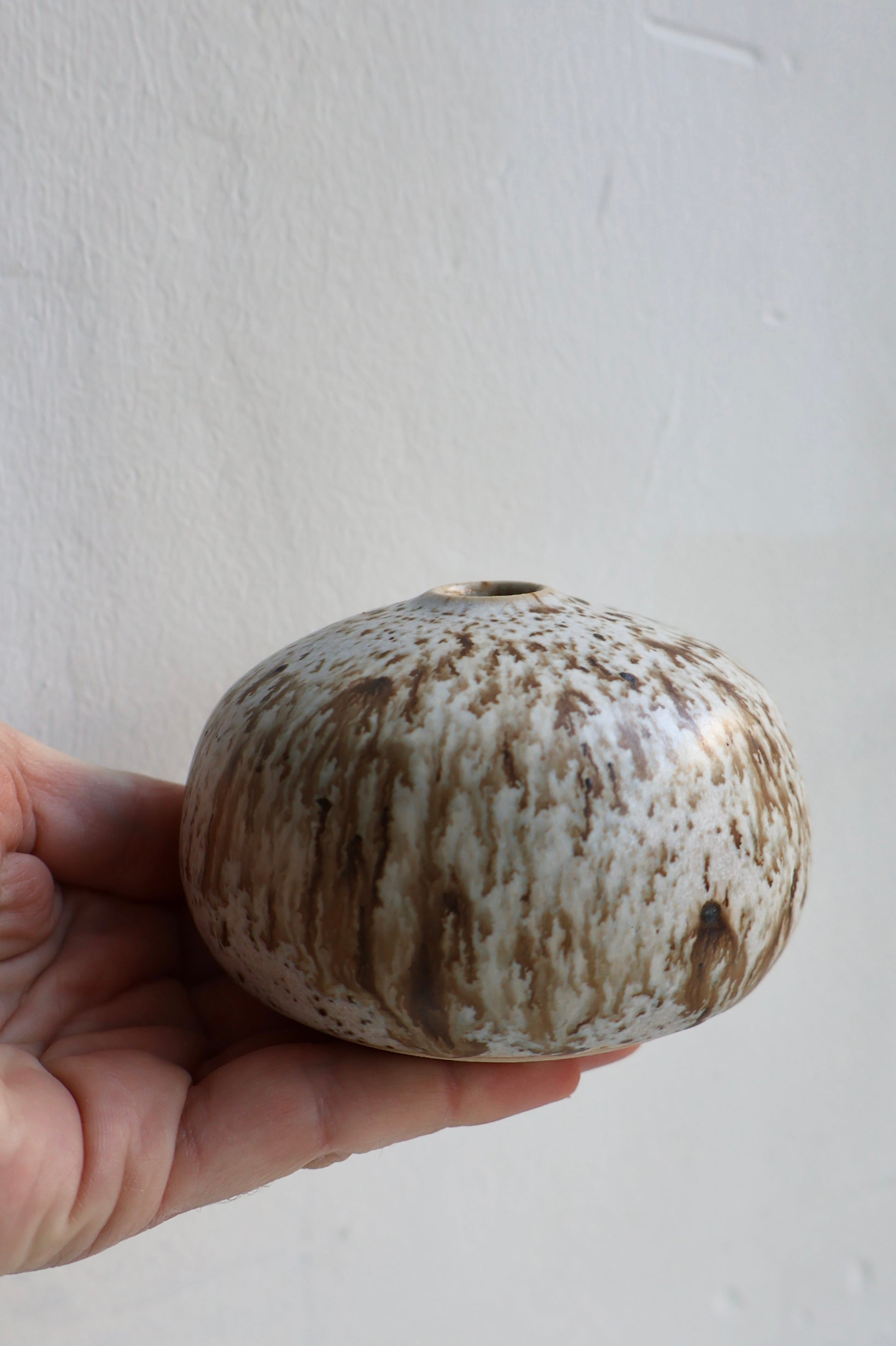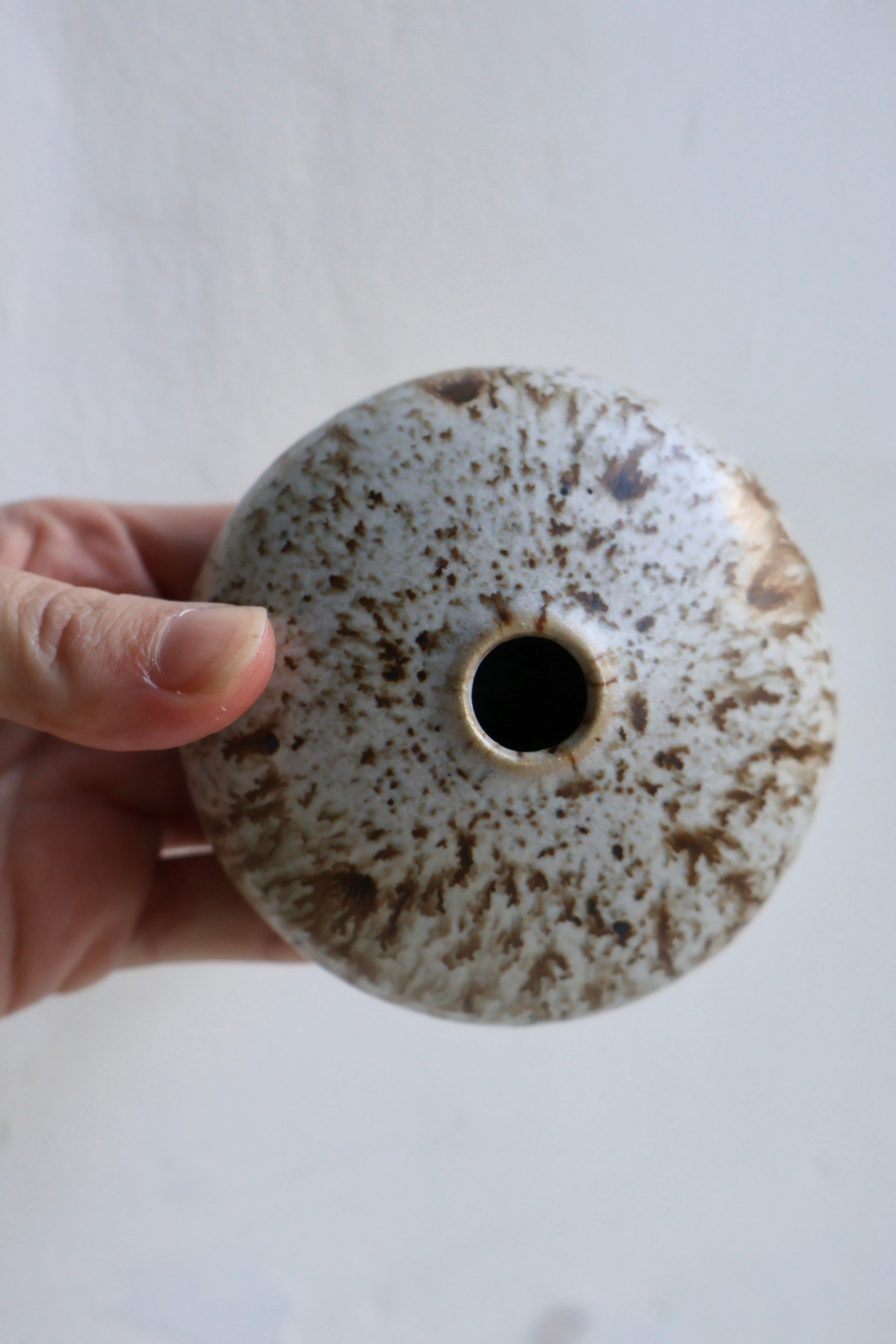 Bud vase glazed in greyish glaze with iron speckles on the outside. White glaze on the inside.