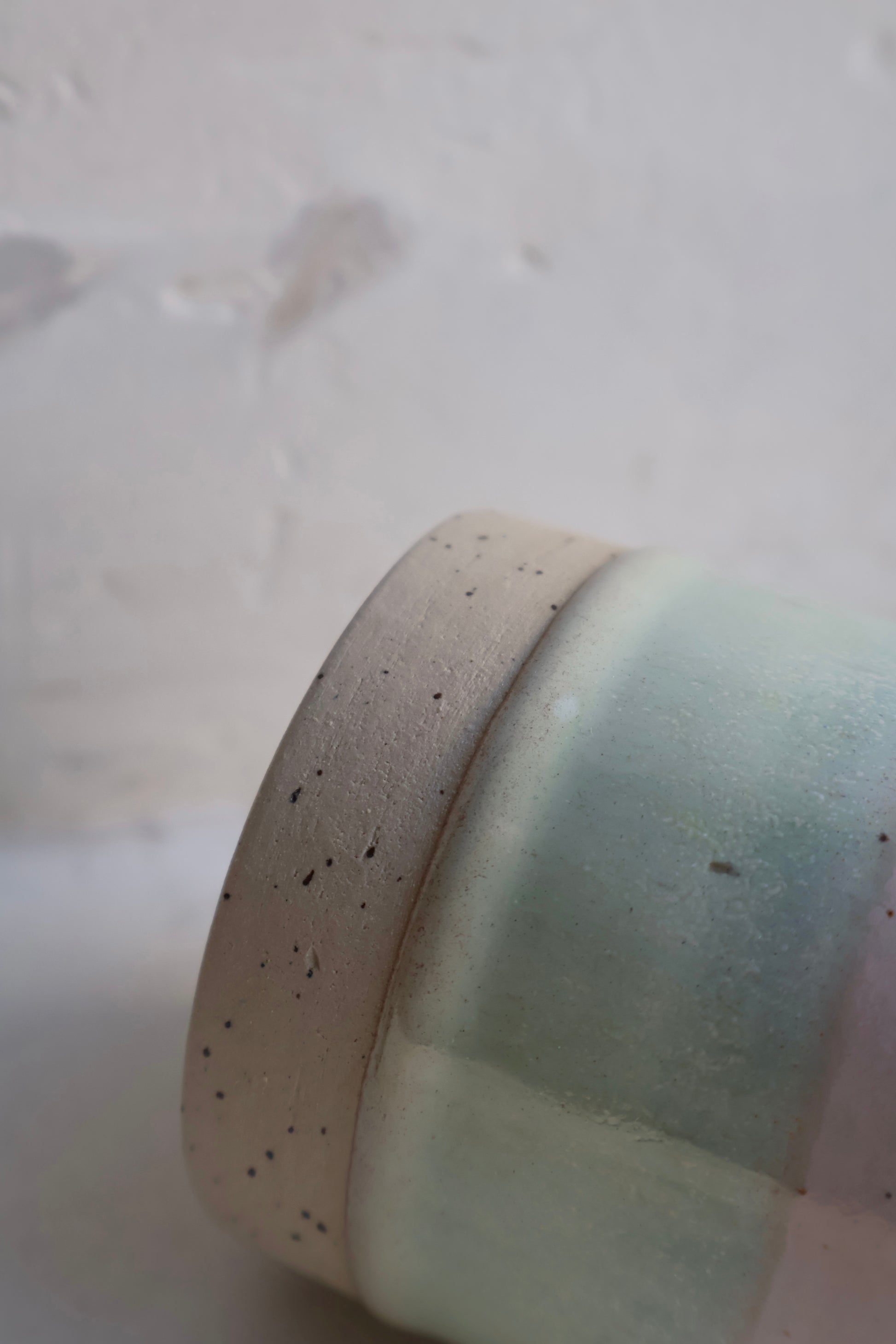 Cup without a handle made in stoneware speckled clay. Glazed in a shiny pastel pink on the inside. Glazed pink and green with a light blue fade on the outside.