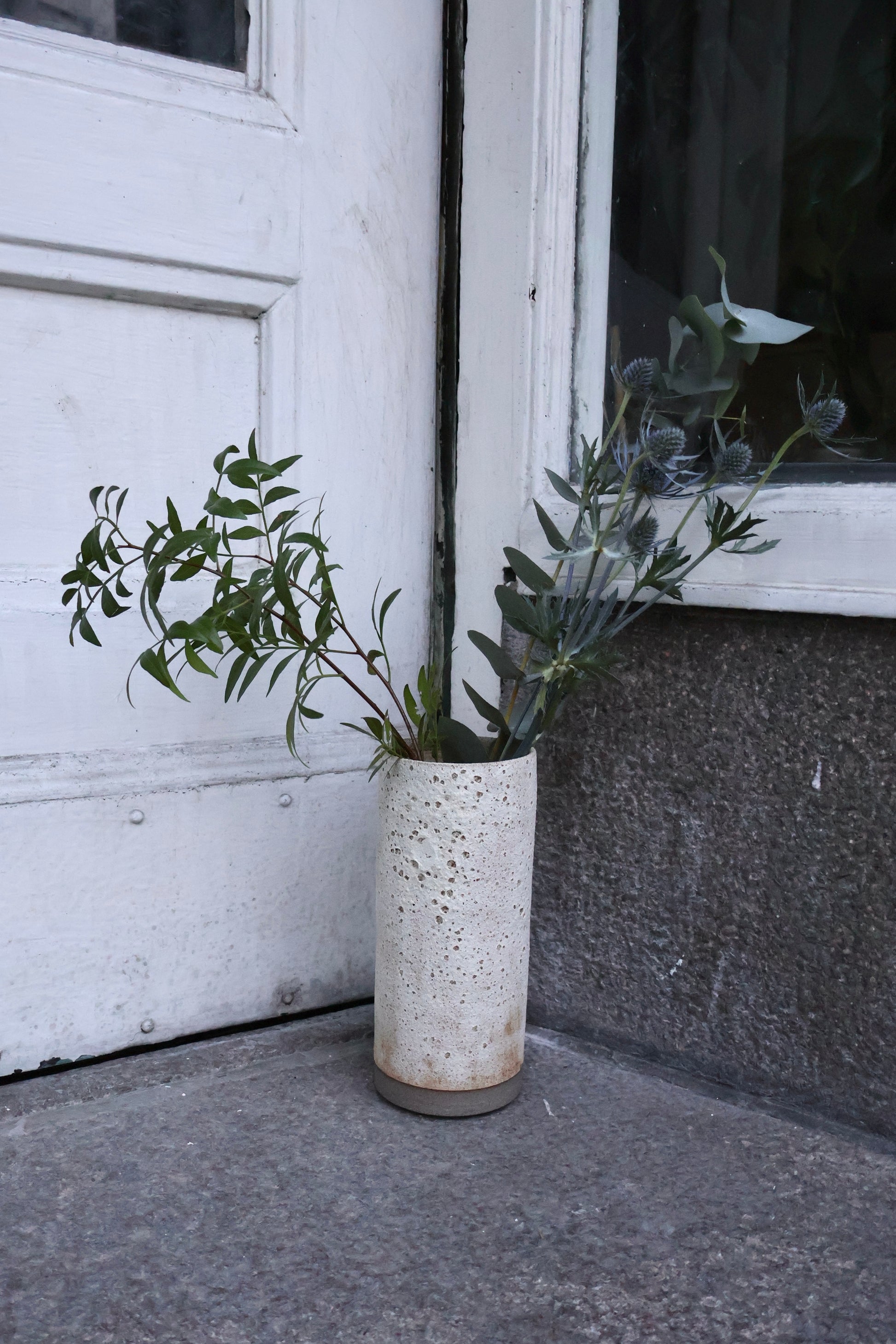 Vase glazed in a brownish white lava glaze on the outside and cream on the inside.