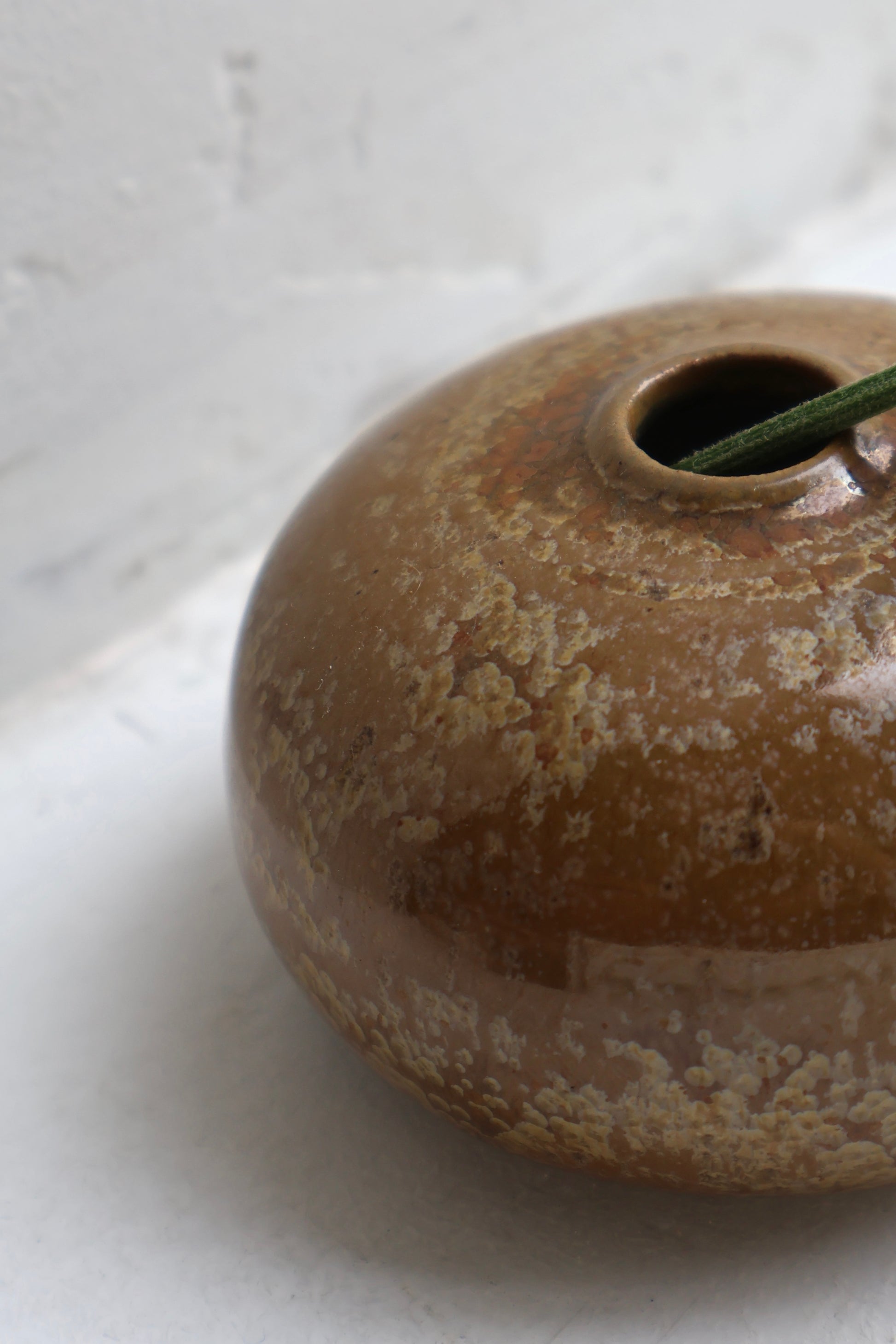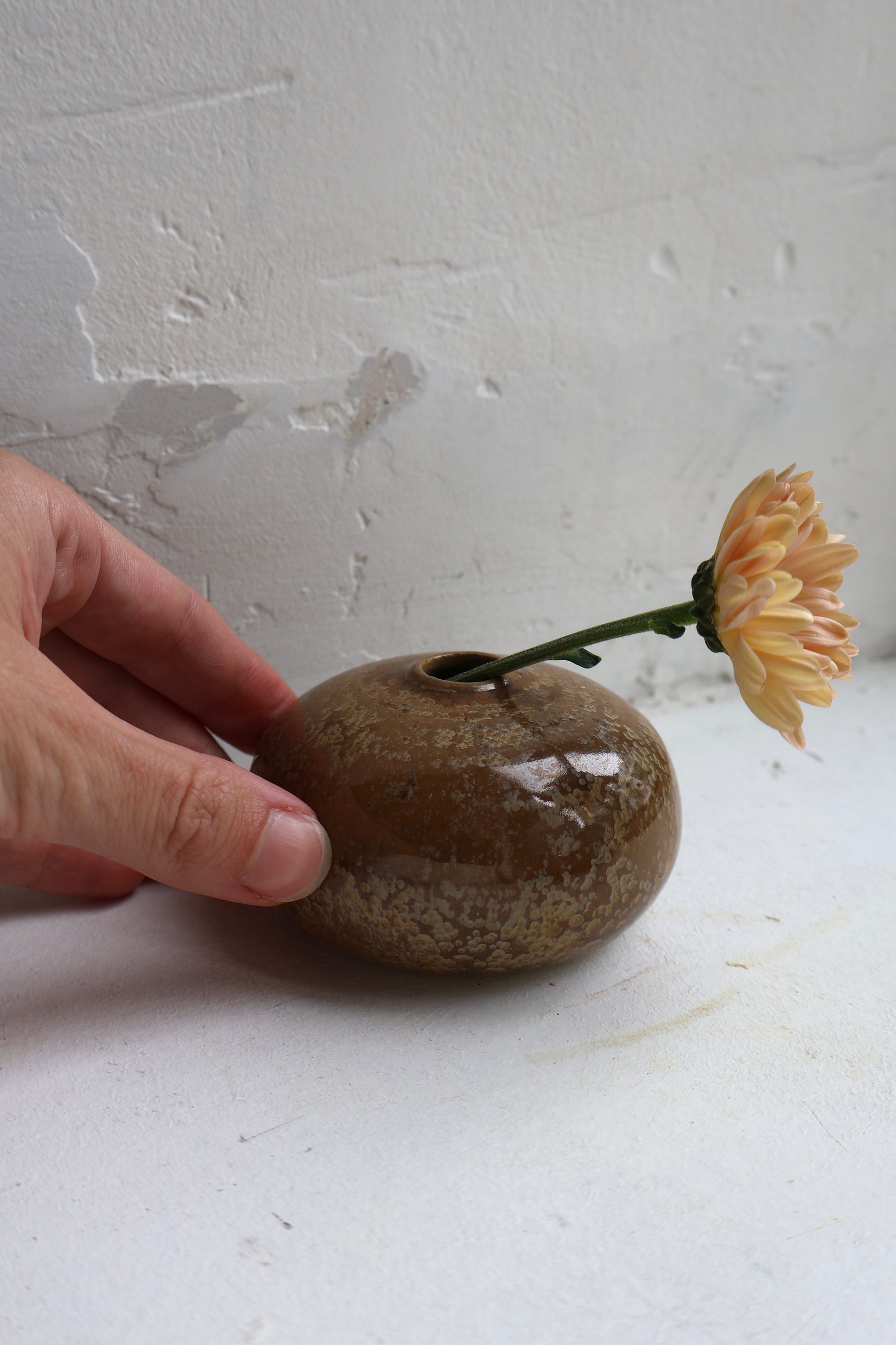 Vase in a speckled white clay glazed in a shiny brown glaze. with light green crystal like glaze speckles.